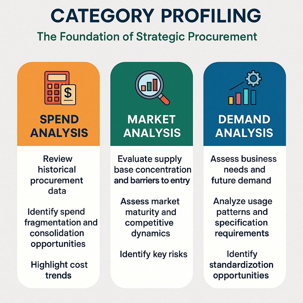 The first and arguably most critical step in successful category management is profiling your category. Before jumping into strategy formulation or market engagement, it’s essential to build a detailed understanding of the category’s internal dynamics and external environment. This is achieved through a combination of spend analysis, market analysis, and demand analysis—each providing a unique lens into the category’s strategic importance and opportunities.